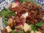 The salad I assembled was a simple fresh spinach, with shreds of red cabbage and roasted zucchini, chopped green apple, with a mound of the barley to which I had added some good feta in chunks, and dressed all lightly with a garlic-olive oil-lemon juice vinaigrette. The result had some of the same appeal of a lentil salad I have had many times over the years at Greens at Fort Mason in the City, altho I like the barley better (maybe that is because barley likes me a bit better than lentils).