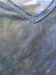 I had one piece which I had to work up my confidence for: a lightweight linen & viscose sweater that I wanted to use with eucalyptus leaves and a bit of copper. The result is both watery and detailed in areas, with clouds of a lovely aqua verdigris that have bloomed a bit in the days since our dye playdate. I think this piece will get a bit of embellishment and I will replace the original buttons (removed as they were made of a metallized plastic that might behave strangely in the dye circumstances, and were, well, just not that nice). One of the good things about doing something like this with other people is the enthusiasm and cross-fertilization of ideas and suggestions, and the support to experiment and embrace the unexpected. Most of this falls into what we would call personal work, not necessarily production work or creating pieces intended to sell or exhibit. That frees me, oftentimes removing the expectation that the work will proceed in s specific direction with a planned outcome. Sometimes I can ignore my internal editor and see where the cloth, paper, or whatever material (even stone) shall take me.