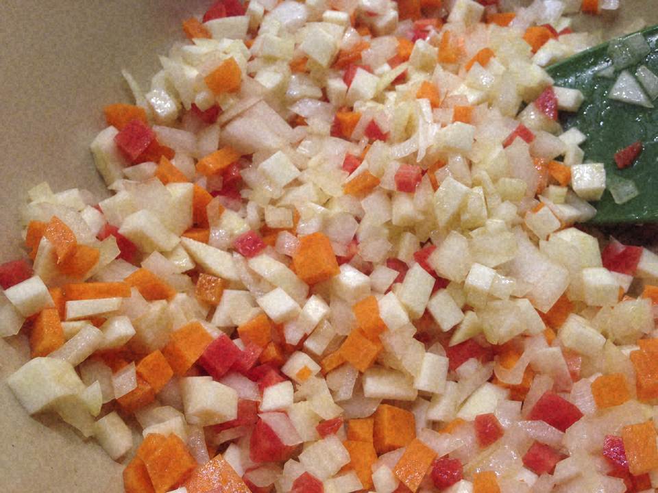 This was actually a proper mirepoix – the beautiful carrots have just started showing up, and the celeriac is tender now.