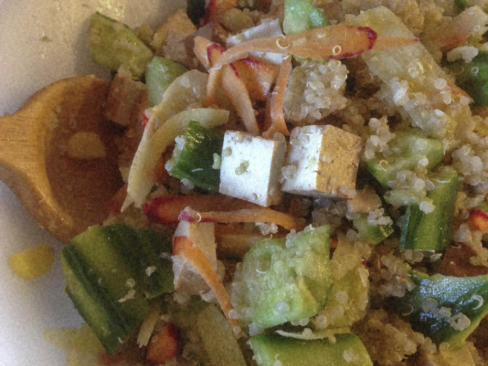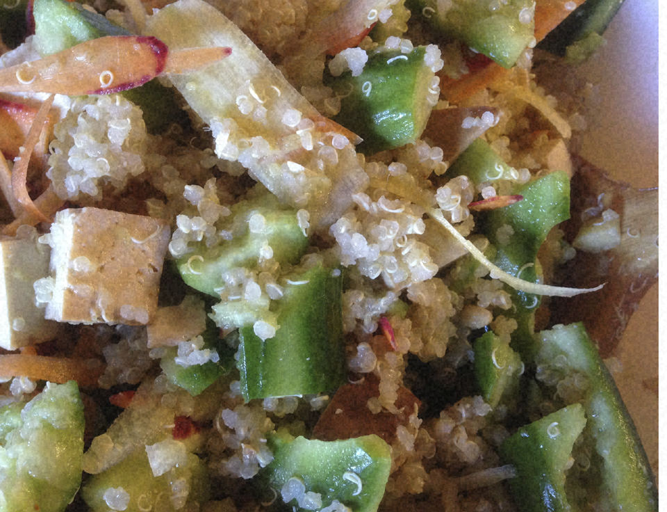 Mix dressing ingredients, pouring over the vegetables, and toss again. If adding quinoa, add last, then toss once more time and serve immediately.