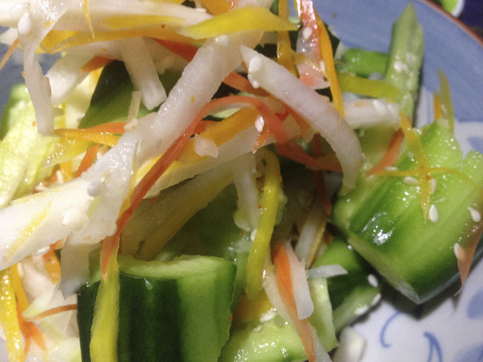 Smash the cucumbers as before, and then toss with the pickled daikon and carrots. I had made a batch for a side dish or to use with Banh mi using a rice vinegar quick pickle , which I also used as a dressing. You might add a little sesame oil if you wish, then sprinkle with sesame seeds and serve.