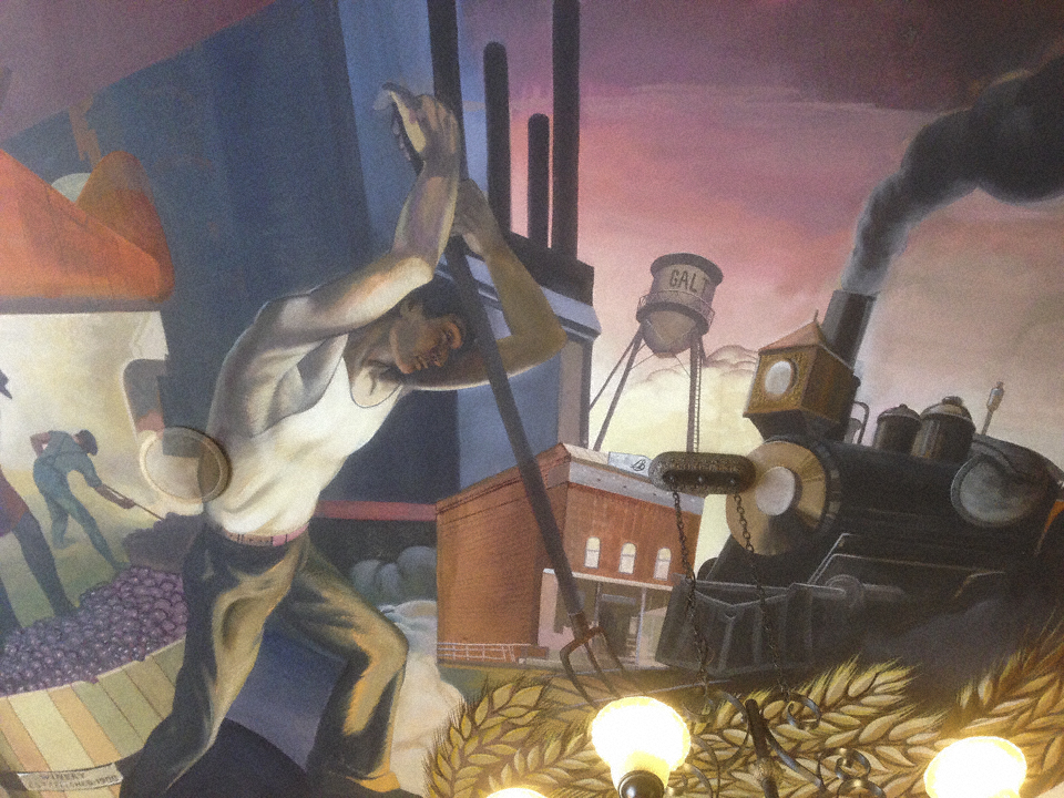 Further along, keeping to small roads, a levee town’s muraled ceiling helps keep the slow road pace of the day, and more history of the west.