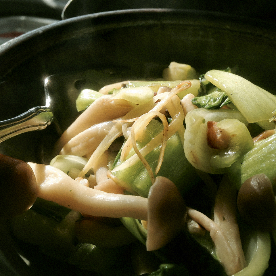 The prep, like most stir-fry recipes, is far more lengthy than the actual cooking. And it is also what makes it so pleasurable and satisfying, especially if you arrange your ingredients for your mis en place in order. The result is a subtle but silky dish with lots of flavour and a lightness. The bit of pancetta (only an ounce) is just enough of a presence to shape the flavour without dominating the dish or making it too salty or smokey. The addition of the mushrooms complemented the texture and flavour of the bok choy stems.