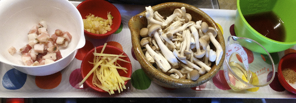 Because I was adding an extra ingredient to this stir-fry, I decided to do so early on, so just after the pancetta and aromatics (ginger + garlic) have been added, after about a minute I added the mushrooms (only 100 grams of Bunashimeji) which I had trimmed, washed, separated and made sure were dry). I wanted to keep too much water from the mushrooms from drowning the dish.