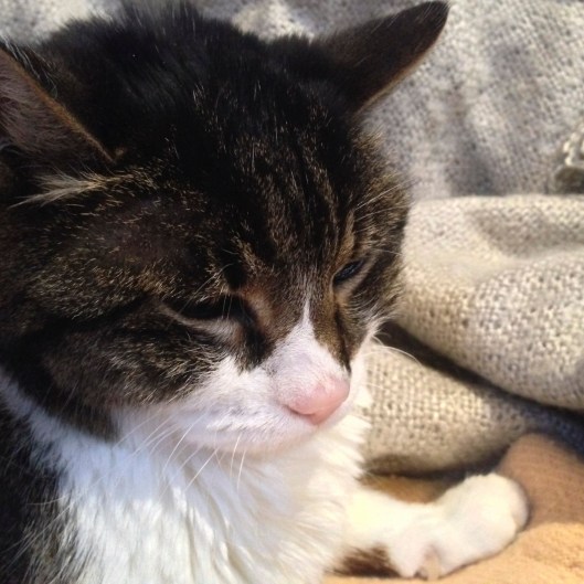 these questions haunt me most when i look for him to greet or comfort me. through whatever life brought outside our door, he was our constant companion within these walls. on the best and worst days, he was with us. knocking my eyeglasses out of adjustment, seeing if he could dip his nose into my cappuccino, alert to the sound of a tuna can being picked up off the pantry shelf, sniffing inspection but not really interested in my brandy. sniffing out a batch of fresh laundry from across the house, digging his way into the warm towels or better, the black garments that didn’t have cat hair on them yet. rolling on the freshly made bed as we tried to change the duvet, curled or spread out in the space between our pillows at night or sandbagging our legs to create his own pillow. padded paws on your knee, head butting you to pay attention. training us to be more useful human servants.